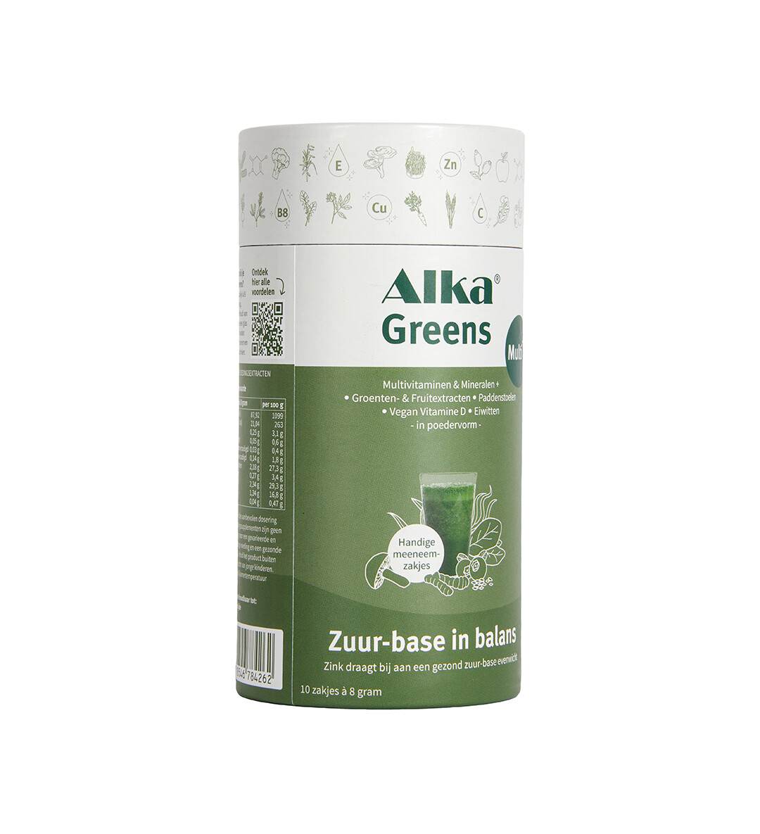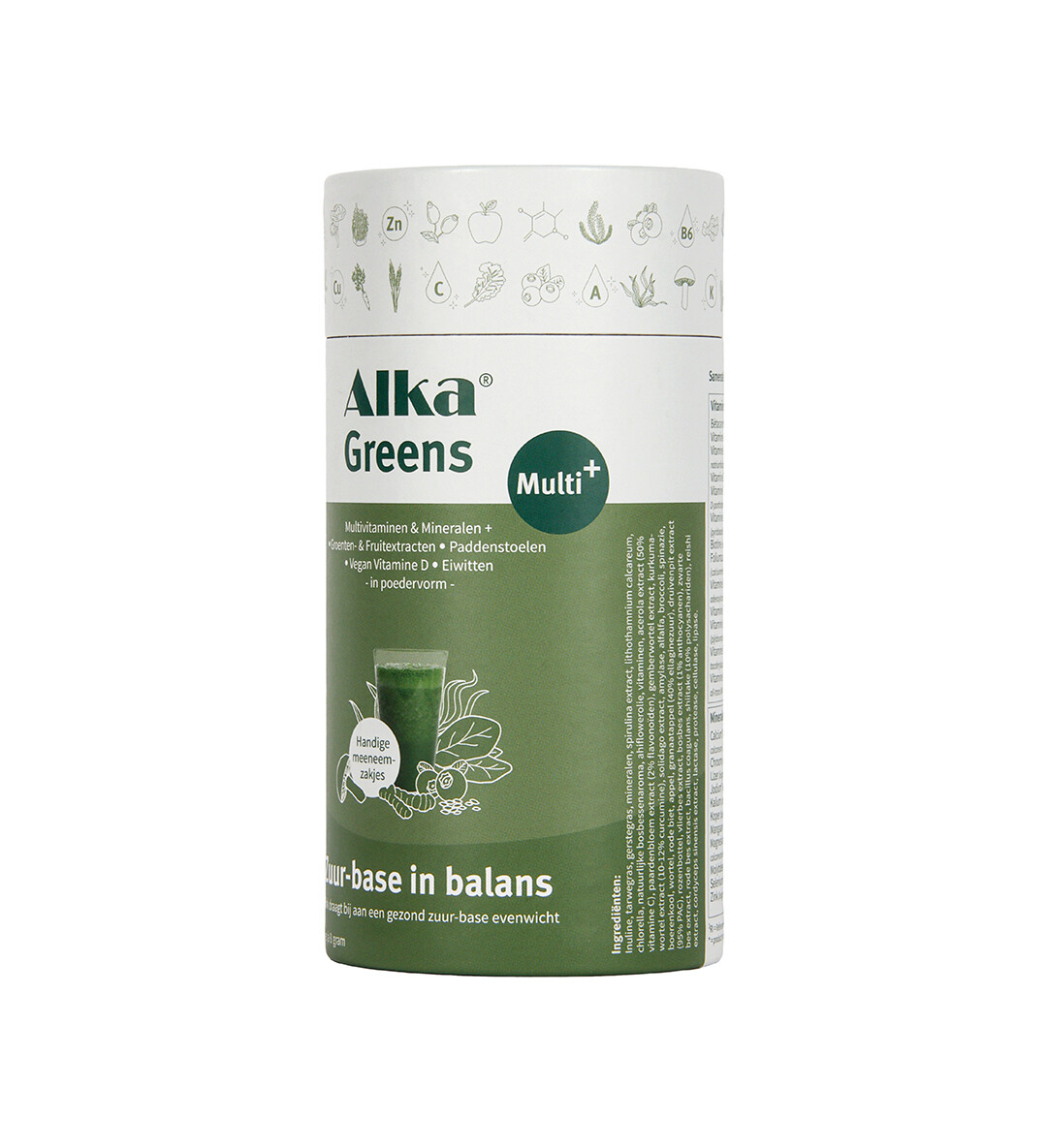Alka Greens Multi+ is volledig vegan, glutenvrij en vrij van lactose, soja en kunstmatige toevoegingen. In het dagelijks leven zorgen factoren als bewerkte voeding, stress, alcohol en veroudering voor ophoping van zure afvalstoffen in het lichaam. Alka Greens Multi+ helpt deze balans te herstellen met basische planten, mineralen en enzymen – voor een natuurlijke ondersteuning van uw gezondheid, elke dag opnieuw. Zink draagt bij ter ondersteuning van een gezond zuur-base evenwicht. Daarnaast ondersteunt zink het immuunsysteem. Vitamine B3 zorgt voor extra energie.