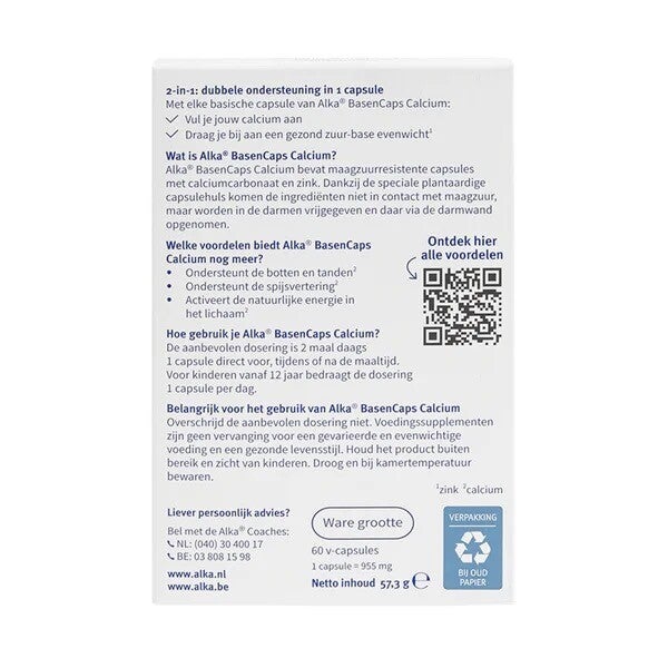 Alka BasenCaps Calcium zijn basische capsules met calciumcarbonaat en zink, verpakt in een maagsapresistente capsule. Dankzij deze speciale coating blijven de ingrediënten beschermt tegen maagzuur. De capsules lossen langzaam op in de darmen waardoor de ingrediënten efficiënt via de darmwand worden opgenomen.