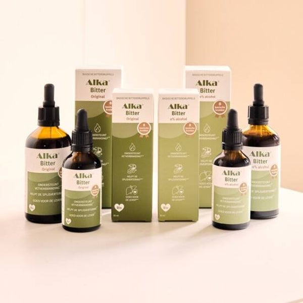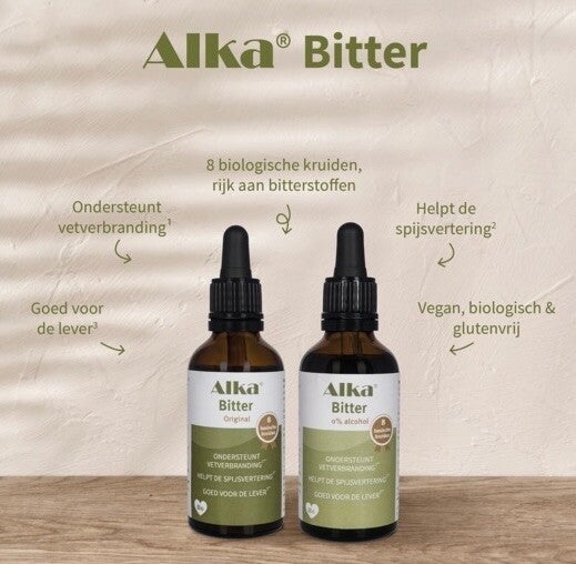 Alka® Bitter is een krachtig kruidenextract met 8 biologische kruiden, rijk aan natuurlijke bitterstoffen. Deze vergeten smaak geeft je lichaam precies die prikkel die het nodig heeft om je spijsvertering, lever en vetverbranding weer optimaal te laten werken.