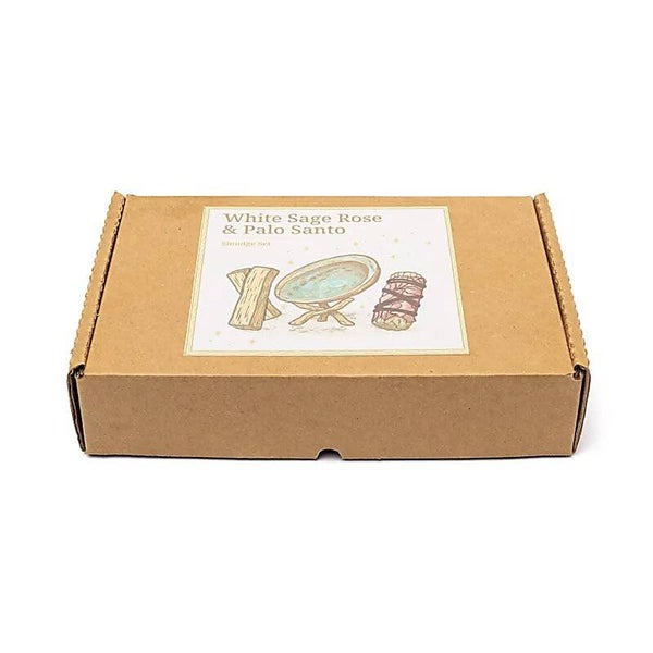 Complete smudge set met witte salie, rozenblaadjes, Palo Santo, abalone schelp en houten driepoot. Direct klaar voor gebruik.
